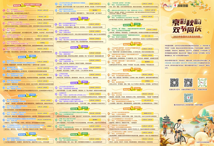 為豐富假期生活,北京市文化和旅游局聯(lián)合百度地圖推出“中秋國慶文旅活動地圖”,集中呈現(xiàn)全市50余項特色文旅活動,涵蓋自然風光、文化體驗、親子娛樂、紅色教育等多個主題,助力公眾輕松規(guī)劃假日行程,盡享京秋韻味。