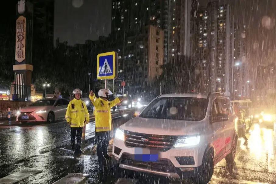比賽當(dāng)晚陣雨不斷,但球迷觀賽熱情未受影響,賽場(chǎng)內(nèi)球員激烈拼搶,看臺(tái)上歡呼聲此起彼伏。為保障賽事安全,沙坪壩區(qū)分局民警、輔警采取“定點(diǎn)+流動(dòng)”相結(jié)合的勤務(wù)模式,在賽場(chǎng)周邊關(guān)鍵點(diǎn)位設(shè)置固定執(zhí)勤崗,同時(shí)組織巡邏組動(dòng)態(tài)排查安全隱患。即便雨水順著帽檐滴落模糊視線,執(zhí)勤人員也始終保持高標(biāo)準(zhǔn)工作狀態(tài),全力維護(hù)賽場(chǎng)內(nèi)外秩序。