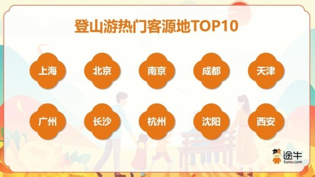 《報(bào)告》數(shù)據(jù)顯示,二線及以上城市用戶是登山游的主力軍,在今年途牛登山游用戶中的出游人次占比超過了70%。其中,上海、北京、南京、成都、天津、廣州、長沙、杭州、沈陽、西安等是排名靠前的客源地城市。