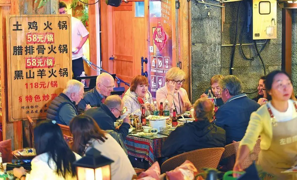 憑借優(yōu)美風(fēng)光、濃郁風(fēng)情、獨(dú)特文化體驗(yàn)和日趨完善的服務(wù),麗江吸引眾多外國游客前來體驗(yàn)“有一種叫云南的生活”。據(jù)麗江市公安局出入境管理支隊(duì)統(tǒng)計(jì)數(shù)據(jù),今年以來,全市臨時(shí)入境人員達(dá)78.97萬人次,同比增長47%。圖為外國游客在麗江古城品嘗美食。(記者 陳飛)