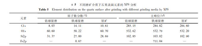 礦物表面性質(zhì)與其浮選行為密切相關(guān),采用 X 射線光電子能譜考察硅酸鹽礦物在不同磨礦介質(zhì)濕磨后表面元素變化的情況,確定礦物表面物質(zhì)的存在形式.不同磨礦介質(zhì)下,硅酸鹽礦物表面元素的 X 射線光電子能譜分析結(jié)果見表 1 ~ 表 5.表 1 ~ 表 5 的研究結(jié)果表明: 與原礦相比,( 1) 氧化鋯珠濕磨后,鋯英石表面 Zr 的原子數(shù)分?jǐn)?shù)由 8. 30% 增加