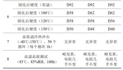 2)球磨35h制得的片狀銀粉制得的導(dǎo)電銀膠,銀膠的粘度、觸變指數(shù)、推力測試、導(dǎo)電性能、點膠、固化后硬度測試、高低溫冷熱沖擊測試及高溫高濕測試均滿足應(yīng)用。