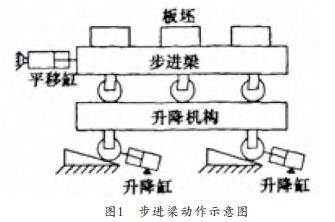 500機組加熱爐目前采用的是推鋼式出鋼,此種方式容易產(chǎn)生黑印、 粘鋼等弊端, 嚴重影響鋼材軋制的質(zhì)量, 應改為目前為常用的步進梁出鋼方式。 步進梁式系統(tǒng)具有技術(shù)成熟、 出鋼高效等點, 其動作方式如圖1所示:
